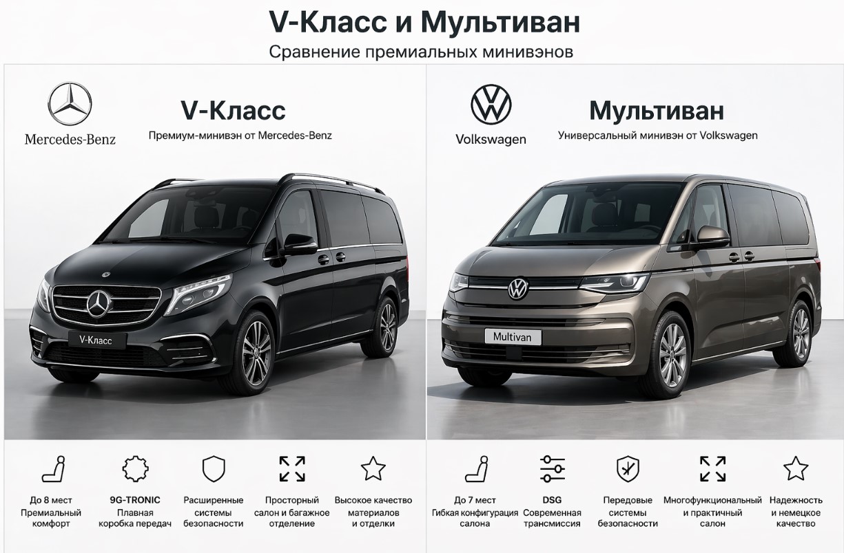 Если важнее комфорт, дорогая атмосфера салона и общее ощущение премиального автомобиля — V-Class часто выглядит привлекательнее. Если важнее практичность и более «рабочая» логика машины, Multivan может быть рациональнее.